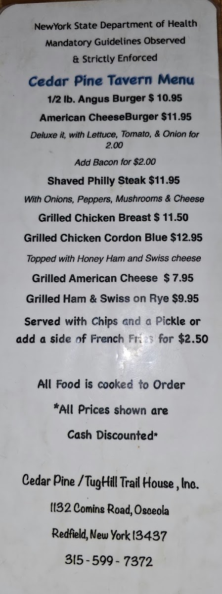 If you're looking for a great spot to enjoy a delicious meal, the Cedar Pine Restaurant Menu has something for everyone. Located at 1132 Comins Rd, Redfield, NY, this cozy eatery offers a wide variety of dishes, perfect for any occasion. Whether you're in the mood for a hearty, flavorful steak or something light and fresh, their menu has you covered. You can always expect quality ingredients and flavors that make each bite a delight. From savory appetizers to indulgent desserts, there's a dish that will hit the spot, no matter your cravings. The warm, inviting atmosphere complements the food perfectly, making every meal here feel like a special experience.